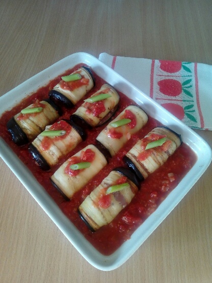 Bakłażany pokroić na podłużne plastry grubości ok. 1 cm. oprószyć solą i odłożyć na 10 min. Patelnię wysmarować połową oliwy, rozgrzać i obsmażyć na niej osuszonego bakłażana po obu stronach. Mięso wymieszać z mozzarellą startą na tarce o grubych oczkach, z oregano, cynamonem, połową czosnku i cebuli oraz sola i pieprzem do smaku. Na patelni rozgrzać resztę oliwy, przesmażyć resztę cebuli, czosnku, tymianku i kurkumy. Następnie dodać pomidory i gotować 7 minut. Po odstawieniu doprawić solą, pieprzem i stewią. Ponadto wmieszać siemię dla uzyskania bardziej zwartej konsystencji. Mięsnym farszem posmarować plastry bakłażana i zwinąć je w rulony. Na dno naczynia żaroodpornego wlać 3/4 sosu, ułożyć na nim roladki, polać resztą sosu i wstawić do piekarnika rozgrzanego do 180 stopni C na 35 minut. Po pół godzinie, zapiekankę posypać parmezanem, wsunąć ponownie do piekarnika i piec jeszcze przez około 5 minut. W międzyczasie komosę ryżową wsypać do rondelka, zalać 1 szklanką wody, dodać 1/2 łyżeczki soli, zagotować a następnie zmniejszyć temperaturę do minimum i dalej prażyć pod przykryciem przez ok. 20 min. Po wyłożeniu na talerze komosy i zapiekanki – wszystko posypać poszatkowaną natką pietruszki lub zielonej dymki.